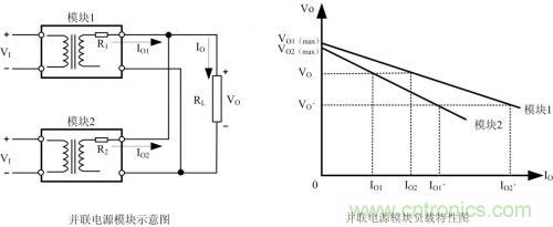 如果兩個模塊的參數(shù)完全相同時,即:VO1(max)= VO2(max)、R1=R2,則兩條負(fù)載特性曲線重合,能實現(xiàn)負(fù)載電流均勻分配。但在實際應(yīng)用中,兩個具有相同容量的模塊,VO1(max)與VO2(max)、R1與R2的參數(shù)也不可能完全做到相同。從圖 2可以看出,由于輸出到負(fù)載RL的等效阻抗R1、R2很小,輸出電壓即便出現(xiàn)很小的差別也會引起輸出電流很大的變化。例如:當(dāng)負(fù)載RL電流由IO= IO1+ IO2增大到IO、=IO1、+IO2、時,負(fù)載特性曲線斜率小的模塊1將承受大部分負(fù)載電流,模塊1將運(yùn)行在滿載或過載限流狀態(tài),影響模塊的可靠性。