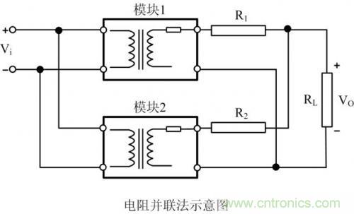圖 3是一種采用比較多的電源并聯(lián)方案:電源輸出電阻并聯(lián)法。在兩組模塊輸出端先分別串接電阻R1、R2,然后再并聯(lián)。此種方案主要利用電阻R1、R2上的線性電壓,使得兩組模塊盡量達(dá)到負(fù)載均衡目的,避免負(fù)載特性曲線斜率小的模塊承受大電流輸出。此并聯(lián)方案成本低,但只適合在精度要求不高、輸出功率不大的場合