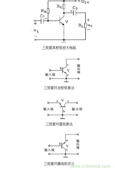 為了更進(jìn)一步的說(shuō)明這種三極管開(kāi)關(guān)電路的設(shè)計(jì)原理,在這里我們以NPN三極管的共發(fā)射極放大電路為例,來(lái)具體的說(shuō)明一下。下圖中所提供的三種連接方式是三極管放大電路最常見(jiàn)的,除了共發(fā)射極聯(lián)接方式外,還有共集電極和共基極聯(lián)接方式。