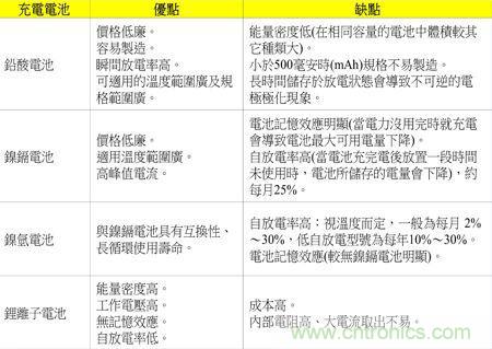 由表1優(yōu)缺點看來,鎳鎘、鎳氫及鋰離子電池較適合使用在電子產(chǎn)品上;而鋰離子電池無論是在體積、重量及容量(電子產(chǎn)品的使用時間)較優(yōu)于鎳鎘、鎳氫電池,也無記憶效應的問題,所以鋰離子電池在電子產(chǎn)品使用上似乎方便許多。