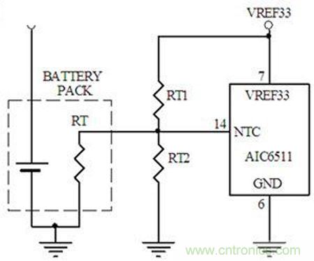 圖5為電池溫度偵測電路,透過圖4中NTC腳位(Pin 14)偵測NTC熱敏電阻的電壓,充電IC能持續(xù)偵測電池的溫度,確保電池溫度的安全操作范圍。