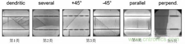 2011年,德國ISFH公布了他們的研究結果:根據電池片隱裂的形狀,可分為5類:樹狀裂紋、綜合型裂紋、斜裂紋、平行于主柵線、垂直于柵線和貫穿整個電池片的裂紋。