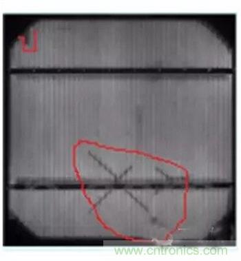 給晶硅組件施加電壓后,所激發出的電子和空穴復合的數量越多,其發射出的光子也就越多,所測得的EL圖像也就越亮;如果有的區域EL圖像比較暗,說明該處產生的電子和空穴數量較少(例如圖3中電池中部),代表該處存在缺陷(復合中心);如果有的區域完全是暗的,代表該處沒有發生電子和空穴的復合(圖3和圖4中紅線所標處),也或者是所發光被其它障礙所遮擋(圖3和圖4主柵線處),無法檢測到信號。