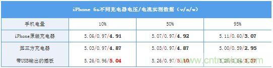 筆者使用了5款不同品牌原配的充電器+2款帶USB輸出的插板進(jìn)行測試(手機(jī)50%電量),發(fā)現(xiàn)輸出電壓基本略微大于5v(某些線補(bǔ)較高的能去到5.3v,而沒有線補(bǔ)的低于5v),而電流也在1a左右。所以使用某些非原裝充電頭對iPhone進(jìn)行充電,確實會比原裝充電頭更快。當(dāng)然,山寨/品質(zhì)低劣的充電器就另說了。