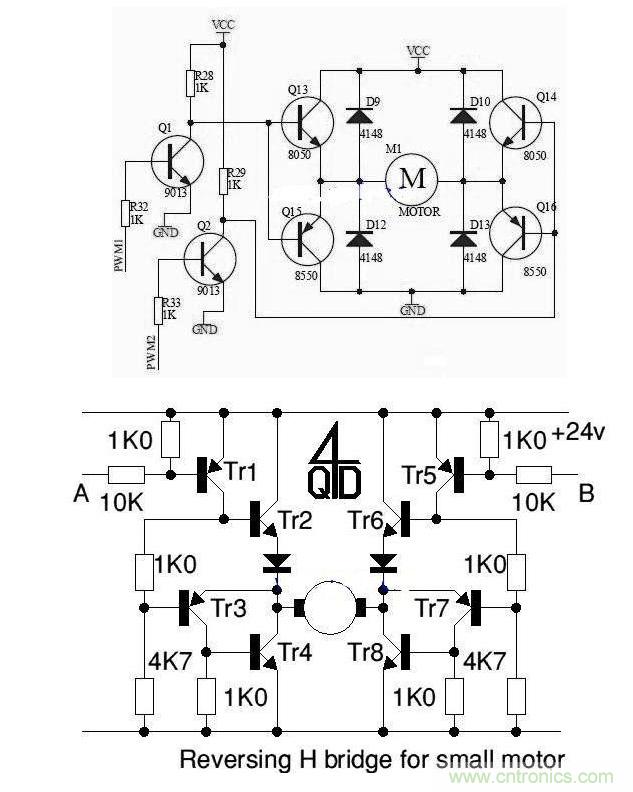 驅動電機時,保證H橋上兩個同側的三極管不會同時導通非常重要。如果三極管Q1和Q2同時導通,那么電流就會從正極穿過兩個三極管直接回到負極。此時,電路中除了三極管外沒有其他任何負載,因此電路上的電流就可能達到最大值(該電流僅受電源性能限制),甚至燒壞三極管。基于上述原因,在實際驅動電路中通常要用硬件電路方便地控制三極管的開關。