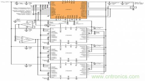 µModule DC/DC 穩壓器可提供一種同時提供高功率輸出和 DPSM 功能的簡單和有效之方法。由于可容易地通過并聯多個 µModule 穩壓器以提供高電流輸出 (各個通道彼此之間的電流匹配準確度標稱值在 1% 以內),從而降低了產生熱點的可能性。而且,只有其中一個 µModule 穩壓器必需具備 DPSM 能力,原因是即使并聯的 µModule 未內置固有的 DPSM,它也能提供完整的數字接口。圖 2 示出了一個 LTM4677 (36A DPSM µModule) 與 3 個 LTM4650 (50A µModule) 相并聯的應用電路原理圖。