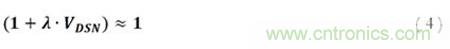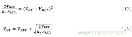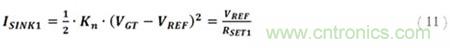 必須注意的是,這里可以很大程度上忽略通道寬度調制的影響。這是因為任何因漏極電壓上升導致的漏極電流的上升會在通過RSET電阻后下降,并導致源電壓的上升。為了使MOSFET能維持任何電流,柵極電壓必須大于源電壓與閾值電壓的和。也就是說,給定一個柵極電壓,源電壓將被限制在至少比柵極電壓小一個閾值電壓的值,且再大的漏極電壓上升也不會提升漏極電流。因此,構建相應運行條件,RSET必須足夠大,從而確保在上述限制下可允許作出以下假設: