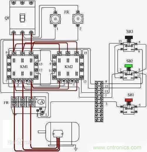 這張圖如果沒有編號6和編號9那兩個接觸器常閉觸點,和編號5和編號8那兩個機械互鎖按鈕的常閉觸點,就很好理解。即按下SB2,電動機正轉,按下SB3,電動機反轉。