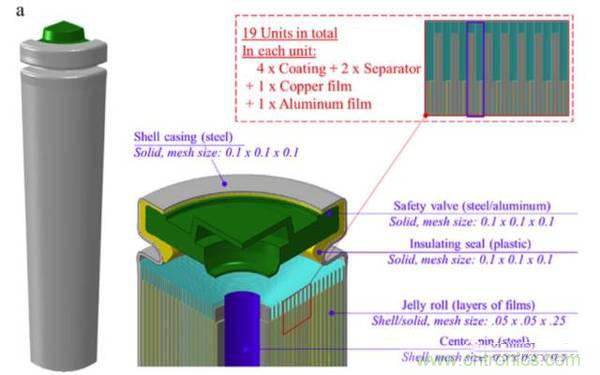 由于在動(dòng)力電池組中18650電池一般是采用垂直裝配的,在電池組發(fā)生跌落等情況下,軸向擠壓是造成鋰離子電池變形的主要原因,因此Juner Zhu主要研究了在軸向壓力下電池變形導(dǎo)致鋰離子電池短路的機(jī)理。一些傳統(tǒng)的模型由于假設(shè)鋰離子電池內(nèi)部是一個(gè)均一的整體,因此在預(yù)測(cè)18650電池軸向壓縮試驗(yàn)的時(shí)候就無法準(zhǔn)確預(yù)測(cè)試驗(yàn)結(jié)果,這主要是由于鋰離子電池電芯的特殊結(jié)構(gòu),導(dǎo)致在電芯的上部和下部并不完全一致,同時(shí)由于鋰離子電池上蓋(也就是正極)獨(dú)特的結(jié)構(gòu)使得鋰離子電池在承受軸向壓力的時(shí)候,可能會(huì)在內(nèi)短路發(fā)生之前,就引起鋰離子電池發(fā)生短路。