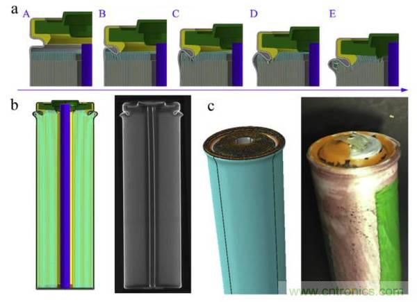 美國(guó)麻省理工學(xué)院的Juner Zhu等人利用18650電池研究了在發(fā)生軸向擠壓的過程中鋰離子電池的發(fā)生熱失控的機(jī)理,并利用有限元分析模型進(jìn)行了仿真分析,該模型還原了不同的軸向壓力對(duì)鋰離子電池造成的影響,分析結(jié)果得到了CT掃描的驗(yàn)證,該仿真分析結(jié)果發(fā)現(xiàn)了兩種可以解釋在擠壓試驗(yàn)中導(dǎo)致鋰離子電池發(fā)生短路原因。