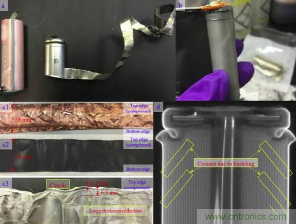 對(duì)試驗(yàn)后的18650電池進(jìn)行拆解顯示,雖然電芯發(fā)生了嚴(yán)重的變形,但是正負(fù)極并沒有發(fā)生斷裂,反而是隔膜在距離上部邊緣1.3mm的位置出現(xiàn)了一個(gè)裂縫,這直接導(dǎo)致了電池發(fā)生短路,電壓突降,而這一裂縫可能是由于金屬箔鋒利的邊緣侵入造成的。此外隔膜的在一些位置厚度出現(xiàn)了很大的下降,這主要是由于凹陷的外殼擠壓電芯造成的。