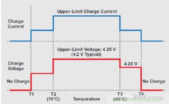 如圖1所示,JEITA規(guī)范定義了最低溫度(T1)、最高溫度(T4)和位于二者之間的三個溫度區(qū)(低、中、高),以確保充電安全。