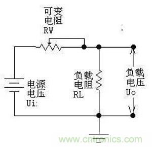 Uo=Ui×RL/(RW+RL),因此通過調(diào)節(jié)RW的大小,即可改變輸出電壓的大小。請注意,在這個式子里,如果我們只看可調(diào)電阻RW的值變化,Uo的輸出并不是線性的,但如果把RW和RL一起看,則是線性的。還要注意,我們這個圖并沒有將RW的引出端畫成連到左邊,而畫在右邊。雖然這從公式上看并沒有什么區(qū)別,但畫在右邊,卻正好反映了“采樣”和“反饋”的概念----實際中的電源,絕大部分都是工作在采樣和反饋的模式下的,使用前饋方法很少,或就是用了,也只是輔助方法而已。