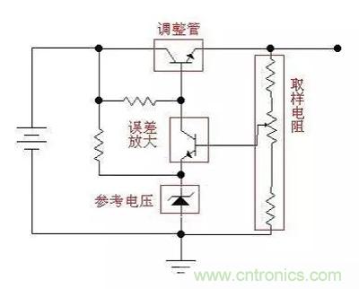 讓我們繼續(xù):如果我們用一個三極管或者場效應(yīng)管,來代替圖中的可變阻器,并通過檢測輸出電壓的大小,來控制這個“變阻器”阻值的大小,使輸出電壓保持恒定,這樣我們就實現(xiàn)了穩(wěn)壓的目的。這個三極管或者場效應(yīng)管是用來調(diào)整電壓輸出大小的,所以叫做調(diào)整管。