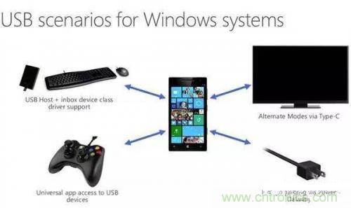 微軟Windows 10引入對Type-C的支持,不僅桌面版Windows 10原生支持USB Type-C接口,手機版Windows 10也支持,可以輕松實現搭載Windows 10操作系統的手機與USB主設備或者是USB配件兩者之間進行數據交換以及視頻共享。例如:手機與USB外圍設備交互數據,支持XboxOne遙控器、鼠標、鍵盤、插座以及使用USB Type-C接口外接顯示器或電視等,Type –C或將開創連接新模式。