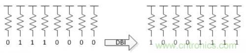 所以,一個降低DDR4系統功耗的方法是,盡量加大DDR4輸出高的數量。這個就是為什么DDR4中多了“DBI管腳”。舉個例子,當8bit lane中有至少有5個DQ都是低時,所有的Bit將會被翻轉,并且DBI(Data Bus Inversion)置低,用來指示數據線的反轉。通過這個方法,總共9個信號中(8個DQ和1個DBI),總有至少5個是被驅動為高電平。如果原始的數據中有4個或者更多的信號被驅動為高時,那么DBI信號也將會設為高,同樣,還是9個里面至少有5個為高。這樣的話,在每一個數據傳輸的過程中,都是至少有5/9的數據是高電平,可以在一定程度上降低了功耗。
