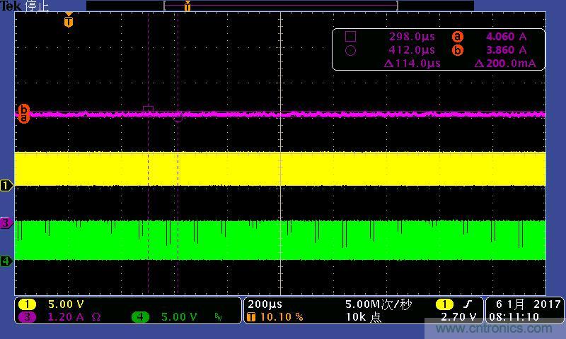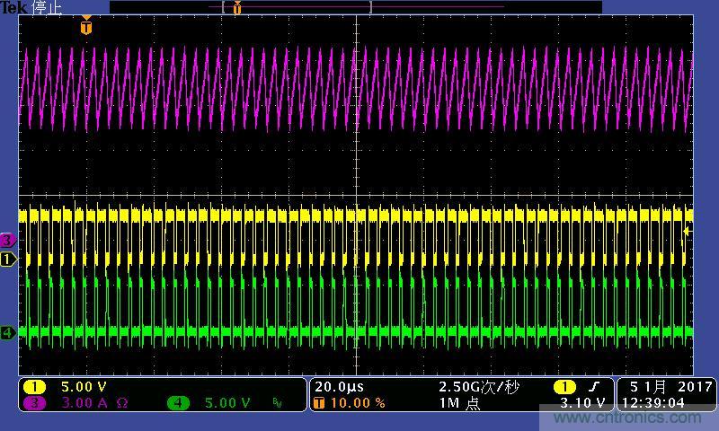 注:功率電感電流波形及高低端MOS管驅(qū)動波形。其中:①黃色:高端驅(qū)動波形;④綠色:低端驅(qū)動波形;③紫色:電感電流