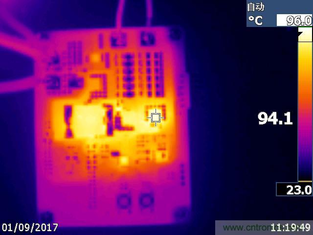 Q1(高端MOS):94.1℃;Q3(低端MOS):88.8℃;Q2(輸出開關MOS):72.5℃;L1(功率電感):89.4℃;U2(控制芯片):88.5℃