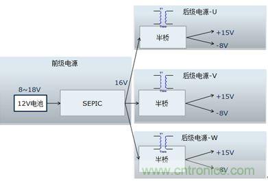 該電源的輸入是新能源乘用車常規的12V電源,該電源通常波動范圍是8~16V,而驅動電源的輸出需要相對穩定。需要設計多組寬壓輸入、定壓輸出的隔離電源。本設計把電源分成兩級:前級電源實現寬壓輸入、定壓輸出功能,后級實現隔離功能,結構見圖1.
