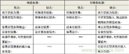 表1.隔離電源與非隔離電源優缺點