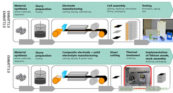 在制造工藝方面,1.0和2.0的制造工藝與現(xiàn)行的鋰離子電池制造工藝沒(méi)有明顯區(qū)別,在3.0上,由于采用全固態(tài)玻璃陶瓷電解液,因此電極和電解質(zhì)的裝配可以在同一步驟完成,省卻了后面的注液環(huán)節(jié),但是后續(xù)增加了熱處理環(huán)節(jié),主要是為了讓電極和固態(tài)電解質(zhì)界面更好的接觸。這3.0項(xiàng)目上,全固態(tài)電解質(zhì)的開(kāi)發(fā)、電解質(zhì)與電極界面兼容性問(wèn)題是重點(diǎn)研究?jī)?nèi)容,這與一般的固態(tài)電池的研究課題是一致的。
