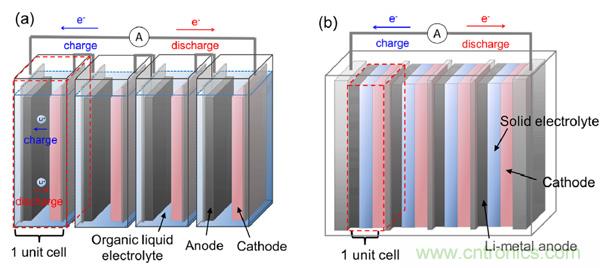 下圖對(duì)比了傳統(tǒng)鋰離子電池(a圖)和雙極性鋰電池(b圖,這里是以金屬鋰和全固態(tài)為例)。a圖中,每個(gè)電池單元unit cell包括了正極(一般涂覆在Al基材)、負(fù)極(一般涂覆在Cu基材);b圖中,每個(gè)電池單元unit cell同樣包括了正極、負(fù)極,但是正極、負(fù)極活性材料共用一個(gè)基材:當(dāng)兩個(gè)電池單元串聯(lián)起來(lái)時(shí),雙極性電極的一側(cè)在當(dāng)前單元電池作為負(fù)極,另一側(cè)在相鄰單元電池中是作為正極。