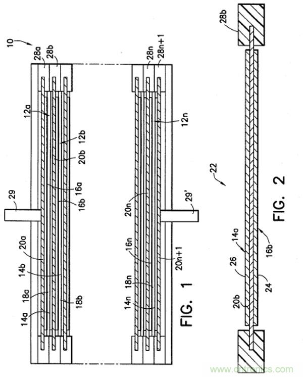 涂層表面上的電流和電勢(shì)達(dá)到更加均勻的分布,因此,采用雙極性cell構(gòu)成的電池具有更高的功率特性。下圖Fig1是一個(gè)典型的由多個(gè)雙極性電池單元構(gòu)成的雙極性鋰離子電池截面圖,F(xiàn)ig2是提取出來(lái)的其中一個(gè)雙極性電池單元。其中,12a、12b,…,12n是電池單元;14a、14b,…,14n是電池單元的正極側(cè);16a、16b,…,16n是電池單元的負(fù)極側(cè);18a、18b,…,18n隔膜;20b、20c,…,20n是集流體(例如,F(xiàn)ig2中的14a和16b共用一個(gè)集流體),集流體可采用雙金屬基材,例如,Cu-Al雙金屬,負(fù)極活性物質(zhì)涂敷在Cu側(cè),正極活性物質(zhì)涂敷在Al側(cè);24是負(fù)極活性物質(zhì),26是正極活性物質(zhì);28a、28b,…,28n是絕緣性連接固定結(jié)構(gòu),每個(gè)雙極性電極通過(guò)該連接結(jié)構(gòu)固定起來(lái)。在Fig1和Fig2中,一共有n-1個(gè)雙極性電極(集流體兩側(cè)分別有正極、負(fù)極活性物質(zhì)),最上層20a只有負(fù)極一側(cè),另一側(cè)跟負(fù)極極柱29相連,最下層20n+1只有正極一側(cè),另一側(cè)跟正極極柱29相連。