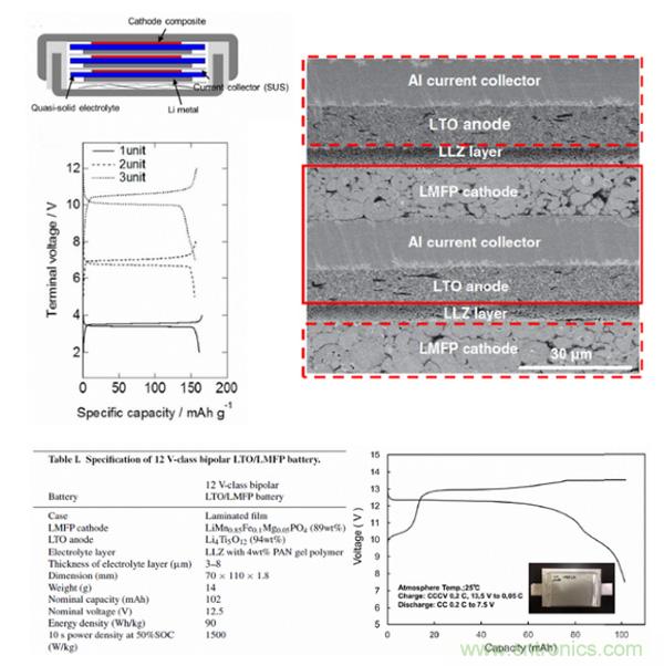下圖是含有三個(gè)雙極性電極的CR2032鈕扣電池。正極是LFP,負(fù)極是金屬鋰,采用準(zhǔn)固態(tài)聚合物電解質(zhì)和不銹鋼集流體。從電壓曲線可以看到,只要改變雙極性電極的unit數(shù)量,就能改變電池的電壓,這里給的分別是1unit、2units、3units的電壓曲線。例如,很容易通過(guò)5個(gè)雙極性的unit實(shí)現(xiàn)一個(gè)12V的鋰離子電池,下圖右側(cè)是日本東芝公司的一個(gè)12V雙極性電池的部分截面圖,從表1的參數(shù)中可以看到,這里正極材料是LiMn0.85Fe0.1Mg0.05PO4,負(fù)極材料是LTO,集流體是Al,固態(tài)電解質(zhì)電解質(zhì)是Li7La3Zr2O12(LLZ)和PAN。從封裝方式來(lái)看,疊片式軟包裝是比較適合雙極性電池的一種方式。