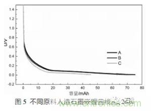 在扣電體系下,對電極為金屬鋰,放電工步對應的是嵌鋰工步。圖5為不同原料人造石墨的在大電流(2C)下的嵌鋰曲線圖。從曲線圖上可以看出:A的嵌鋰平臺最高。由XRD數據可知A的各項同性性能較好。