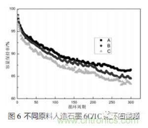 圖6為不同原料人造石墨倍率循環曲線圖。在6C/1C測試條件下,A材料的300周容量保持率為86.45%,倍率循環性能表現最好。