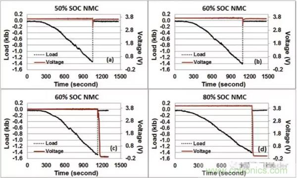 在對25Ah的NMC電池擠壓-扭轉測試中,發現50%SoC狀態下的電池都成功通過了測試,如圖a所示,60%SoC狀態下的電池有三只通過了測試,如圖b所示,另外的三只沒有通過測試,如圖c所示,可見60%SoC的電池通過測試和不通過測試的概率各為50%,而80%SoC的電池則都沒有通過測試,如圖d所示。由此可見,60%SoC是NMC電池安全性的一個分水嶺,低于這個數值時電池相對是安全的,高于這個數值,則電池在機械濫用的情況下的安全性將大大下降。