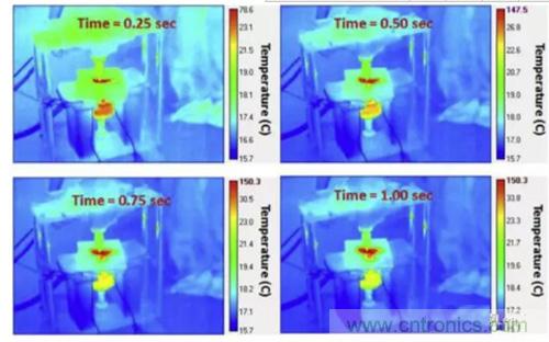 下圖為60%SoC的NMC電池在擠壓-扭轉實驗中的熱成像圖,從圖中可以看到在短路發生后,短路點的溫度在0.5S內迅速升高到了147.5 ℃,隨后高溫區域迅速向周圍擴展,說明周圍區域溫度升高并不是由熱傳導導致的,而是高溫引發了其他的化學反應。而在80%SoC下,NMC電池發生熱失控的溫度更高,引起周圍化學反應的速度也更快。