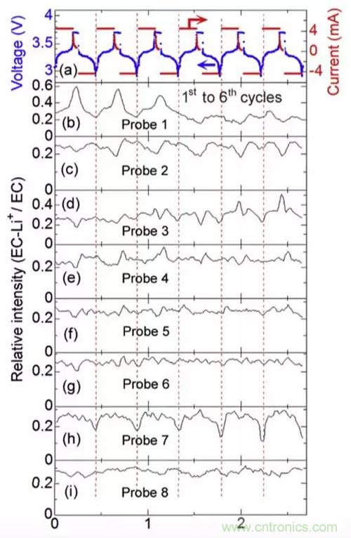 在研究Li+濃度的變化過程中,Toshiro Yamanaka還發現電解液的分布也隨著充放電而發生變化。下圖是在充放電過程中不同位置溶劑EC的強度的變化趨勢,EC的強度變化主要反映該處電解液的數量多少,隨著電芯的體積變化,電芯內的電解液分布也在不斷的發生著變化。例如在1號和2號位置,EC的濃度發生了兩次快速下降和緩慢恢復,6號探測器的位置,則出現了EC濃度的快速下降和快速上升,這些變化都反映了鋰離子電池內部在充放電過程中,由于電極的體積膨脹,導致電解液在電芯的局部發生變干、再浸潤的過程。