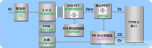 該設(shè)計主要采用安森美半導(dǎo)體的初級端高頻準諧振反激式PWM控制器NCP1340、次級端同步整流控制器NCP4306、同步FET NTMFS6B03、開關(guān)FET ATP104和偉詮的PD3.0協(xié)議控制器WT6632F/WT6615F。方案框圖如圖1所示。