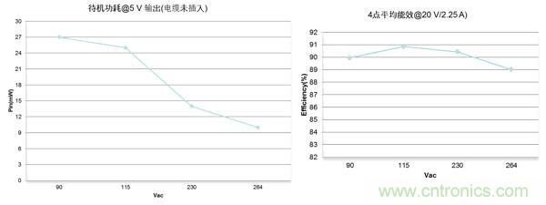 我們在90 Vac、115 Vac、230 Vac、264 Vac 條件下,測得該方案于5 V輸出(電纜未插入)的待機功耗都低于27 mW,在評估板端測得在115 Vac和230 Vac的條件下,20 V/2.25 A輸出的平均能效超過90%。