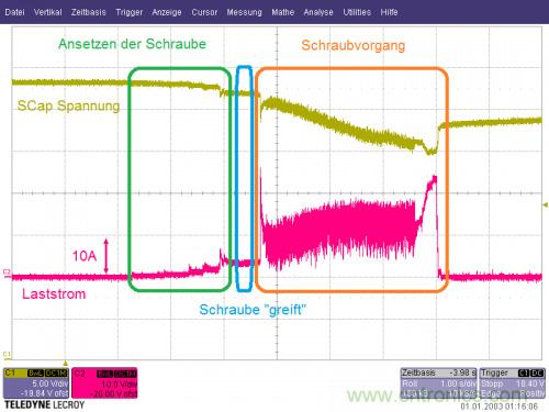 圖5顯示了測量得出的電鉆及電動螺絲刀工作循環。帶有短時脈沖和極具波動特點的工作電流(圖中的Imax約25A,根據電鉆及電動螺絲刀具體情況也可最高達到85A)可與電池輸出電流完全隔離,以便電池始終能在其定義的舒適區域運行(典型的穩定電池電流2-3A)。同時這也會對其使用壽命產生持續性積極影響。