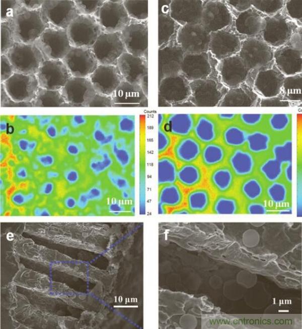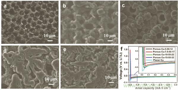 a-d)半徑分別為5 μm,7.5 μm,10 μm及15 μm的多孔銅集流體上沉積鋰的SEM圖