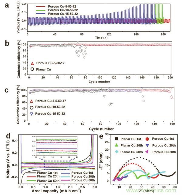 b)鋰沉積在平板銅及多孔Cu-5-50-12時的循環穩定性能及庫倫效率