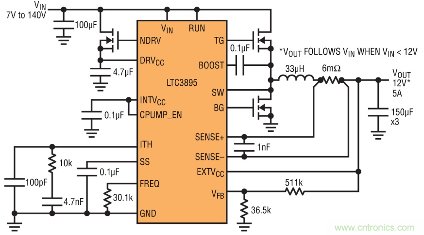 由于在單電池或雙電池供電車輛中,冷車發(fā)動(dòng)和負(fù)載突降情況很常見,所以很多交通運(yùn)輸系統(tǒng)都提供很寬的輸入電壓范圍。而且使情況更加復(fù)雜的是,所需輸出電壓有可能超出這種已經(jīng)很寬的輸入電壓范圍。因此,系統(tǒng)設(shè)計(jì)師面臨的復(fù)雜問題是,無論輸入電壓是高于、低于還是等于輸出電壓,所設(shè)計(jì)的解決方案都必須允許固定輸出。