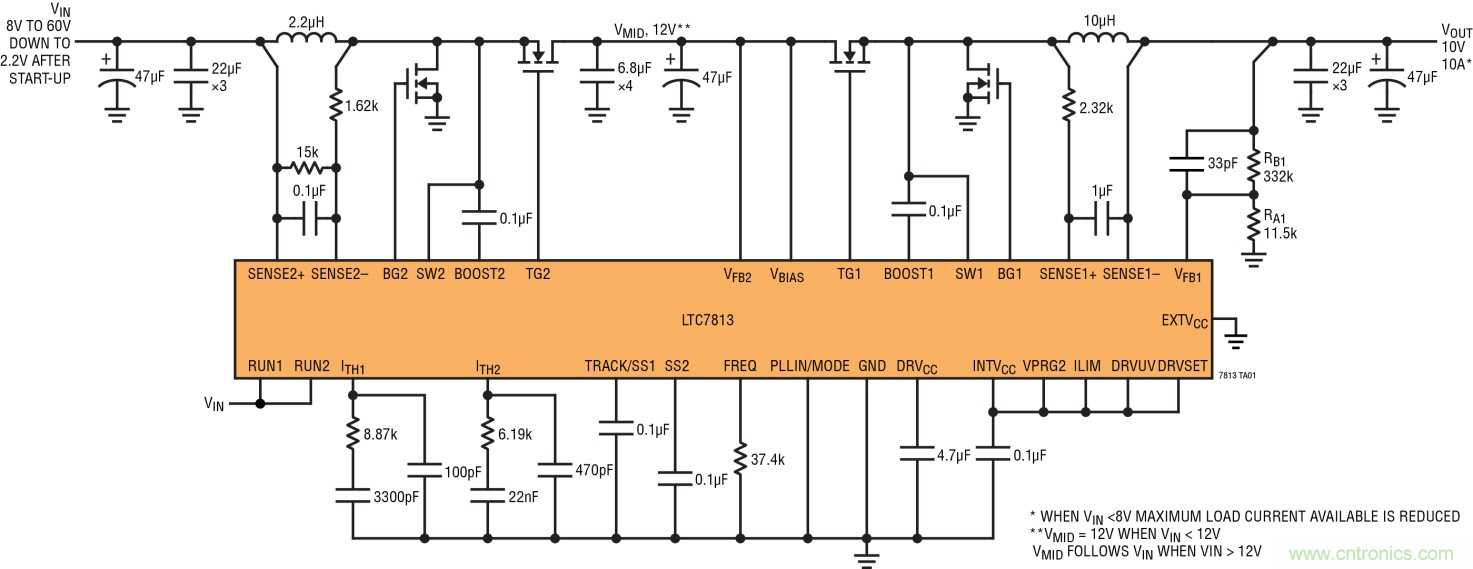 解決汽車?yán)滠嚢l(fā)動(dòng)問題的另一種方法是,采用升壓型轉(zhuǎn)換器,后面再跟一個(gè)降壓型轉(zhuǎn)換器。在這種拓?fù)渲校瑥膯坞姵靥峁┑纳龎盒娃D(zhuǎn)換器之輸出設(shè)定為比電池的標(biāo)稱電壓高出幾伏,然后再用一個(gè)降壓型轉(zhuǎn)換器對(duì)其降壓,使其達(dá)到下游電子組件所需的工作電壓。盡管這種方法需要兩個(gè)轉(zhuǎn)換器,但是ADI公司已經(jīng)開發(fā)出一款整合了升壓型控制器和降壓型控制器的器件,兩個(gè)控制器既可獨(dú)立使用,又可作為升壓-降壓跟隨器使用。圖 5 中用LTC7813 說明這種器件的工作原理。