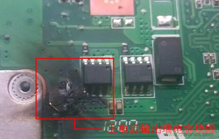 較于上一種電源模塊損壞的情況而言,更可怕的情況就是,不僅壞了電源甚至把整個(gè)電路都燒毀了。具體的現(xiàn)象就是電源模塊剛上電就燒毀冒煙了,輸入端的電容炸裂,如圖3所示,這一類(lèi)問(wèn)題是最為嚴(yán)重的,需要在前期設(shè)計(jì)中盡量避免,那么若是已經(jīng)發(fā)生了這一情況,它到底是什么原因?qū)е碌哪兀烤唧w如下所示: