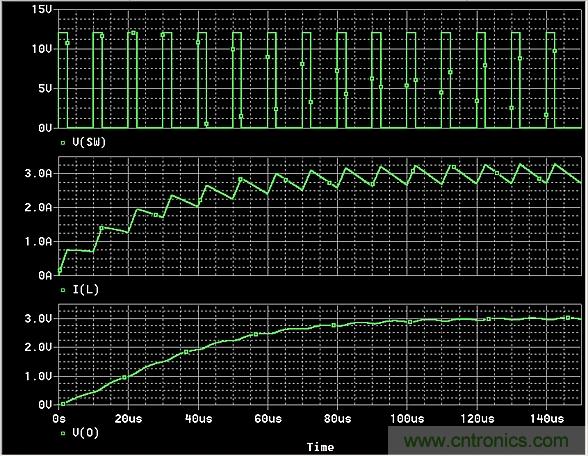 多年來,我遇到過許多沒機會充分掌握DC-DC轉換器斜率補償概念的工程師。我將以降壓轉換器為例,嘗試澄清這個概念。圖1說明了降壓轉換原理。開關以頻率fS在源VI和地之間切換。相應周期為TS= 1/fS,開關處于“向上”位置的TS部分表示為DTS,其中D是占空比(0 < D < 1)。對fS= 100kHz和D = 0.25的電路進行PSpice仿真得到圖2的波形。將電路看作低通濾波器,我們注意到,在初始瞬態之后,電路達到一種穩定狀態,VO穩定在3V左右,雖然有少量紋波。如果將D提高到0.5,VO將穩定在6V左右;如果將D提升到0.75,VO將穩定在約9V。