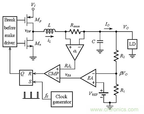控制器如何調整D?控制器有兩類:電壓模式和電流模式控制器。下面將討論電流模式控制器下面的一個常見類型——峰值電流模式控制(PCMC),圖3是它的一個示例。為感測電感電流iL,電路使用一個小串聯電阻Rsense,其壓降由具有ai增益的放大器放大。該放大器將iL轉換成電壓RiiL,其中: