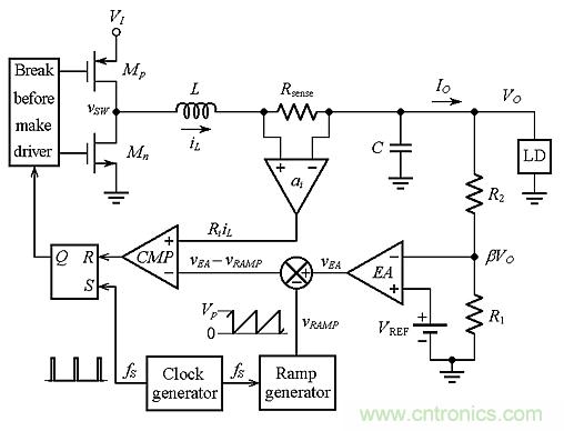 圖9給出了修改圖3的電路以實現斜率補償的一種方法。該電路現在包含一個以fS頻率工作的鋸齒波發生器,從vEA中減去其輸出vRAMP,產生iL所期望的峰值軌跡。使用斜率補償,圖5的波形如圖10所示變化,其中iEA(comp) = (vEA– vRAMP)/Ri。