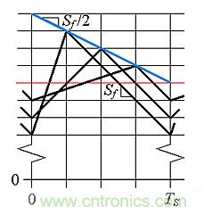 第二個缺陷是稱為次諧波振蕩的不穩定形式,當D>0.5時會產生這種不穩定。圖6顯示了周期開始時電感電流擾動il(0)如何在周期結束時演化為擾動il(TS)。例如,擾動可能由前一周期中比較器失能引起。借助簡單的幾何,我們可以得出il(0)/△t = Sn和il(TS)/△t = Sf。消除△t,得出:
