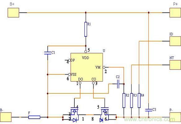 該保護回路由兩個MOSFET(T1、T2)和一個控制IC(N1)外加一些阻容元件構成??刂艻C負責監測電池電壓與回路電流,并控制兩個MOSFET的柵極,MOSFET在電路中起開關作用,分別控