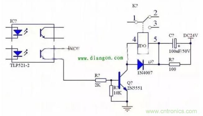 當輸入高電平時,晶體管T1飽和導通,繼電器線圈通電,觸點吸合。當輸入低電平時,晶體管T1截止,繼電器線圈斷電,觸點斷開。
