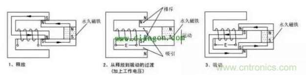 由永久磁鐵保持釋放狀態,加上工作電壓后,電磁感應使銜鐵與永久磁鐵產生吸引和排斥力矩,產生向下的運動,最后達到吸合狀態。