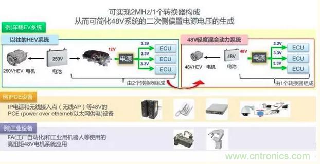 Nano Pulse Control技術于2017年8月發布,已廣泛應用于針對汽車、工業的多款降壓芯片中。應用了該技術的BD9V100MUF的性能大大提升,實現世界最短導通時間9ns,同時在f=2MHz條件下,由48V輸入直接輸出1V成為可能,適用于48V輕度混合動力系統和一些無線通信以及工業設備。