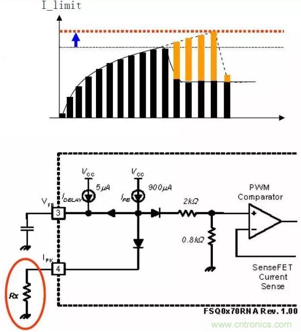 1)增大峰值電流限流點I_limit,可允許流過更大電感電流Id:將與Pin4相接的電阻增大,從內部電流源Ifb分流更小,使作為電流限制參考電壓的PWM比較器正輸入端的電壓將上升,即允許更大的電流通過MOSFET/變壓器,可以提供更大的能量。